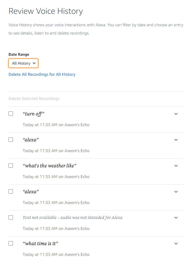 Go ahead and click on Review Voice History and then choose All History from the drop down. You’ll now see all your command history from all your devices here. Click Delete All Recordings for All History to delete all of your voice history.