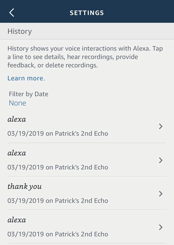 From Settings, choose **Alexa Account **and then History.