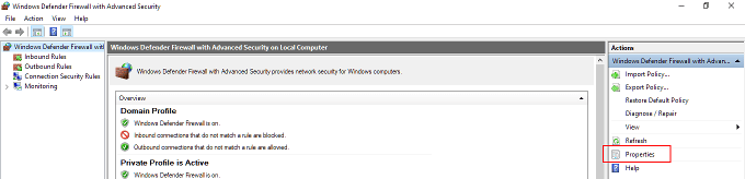 - In the Windows Firewall and Advanced Security window highlight “Windows Defender Firewall with Advanced Security on Local Computer” in the left side menu. On the far right side menu under “Actions” click Properties.