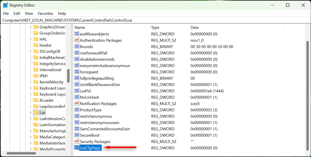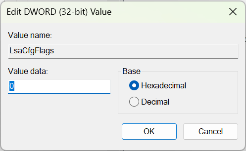 - In the right-hand window pane, locate LsaCfgFlags. If it doesn’t exist, right-click in the window, select New > DWORD (32-bit) Value, and name it “LsaC gFlags.” * Double-click the LsaCfgFlags DWORD and change the Value data field to 0.
