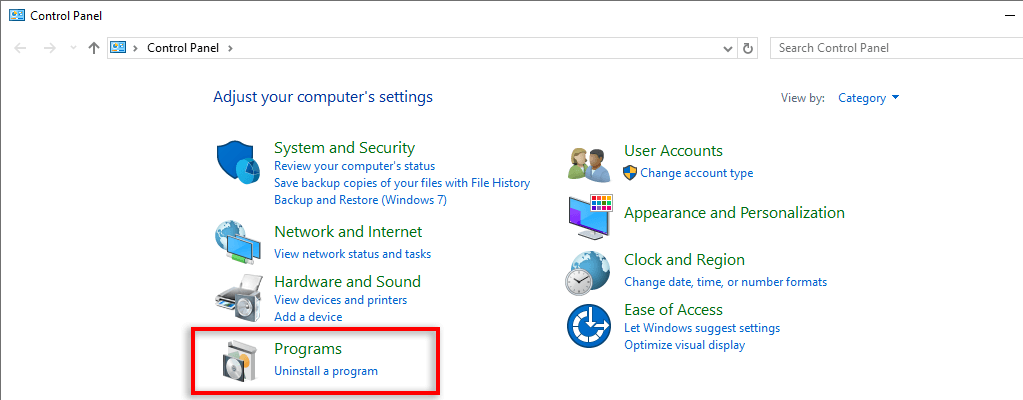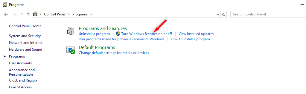 - Choose Programs and Features.