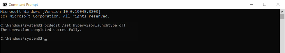- You should receive a message saying that the command was successful. When you do, restart your PC to ensure that Hyper-V is disabled.