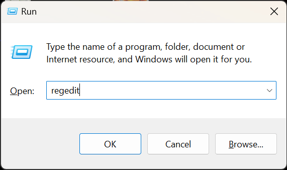 - Type Regedit and press Enter.