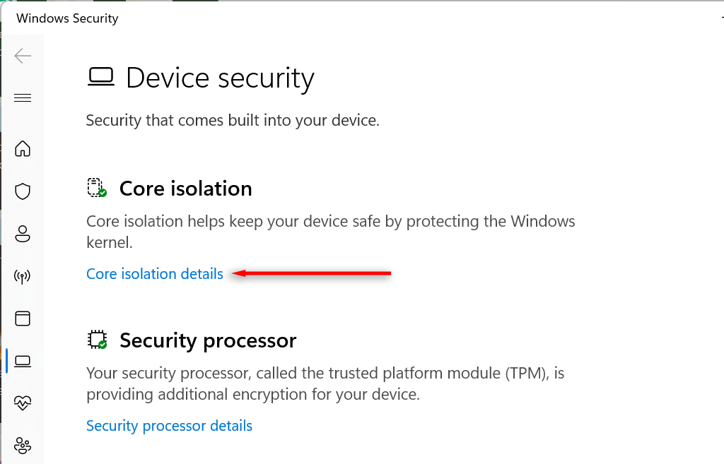 - Choose Windows Security and select Device security. * Select Core isolation details.