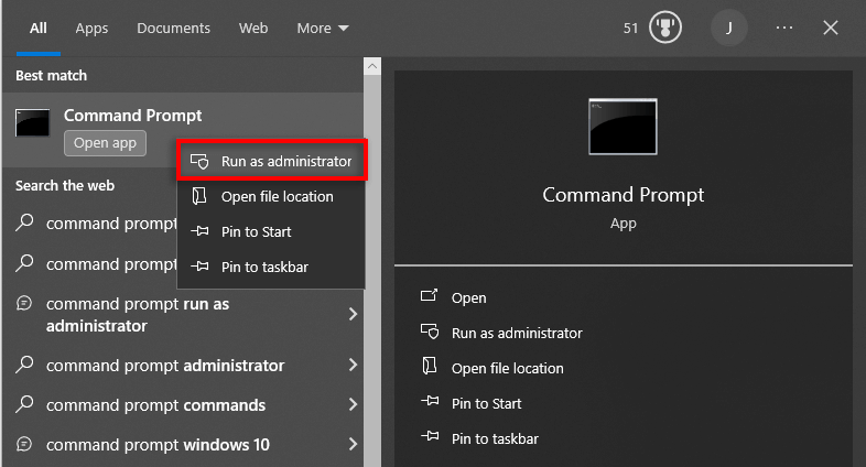 - Right-click Command Prompt and press Run as Administrator.