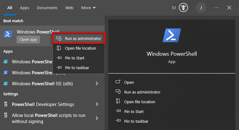 - Right-click PowerShell and select Run as administrator.