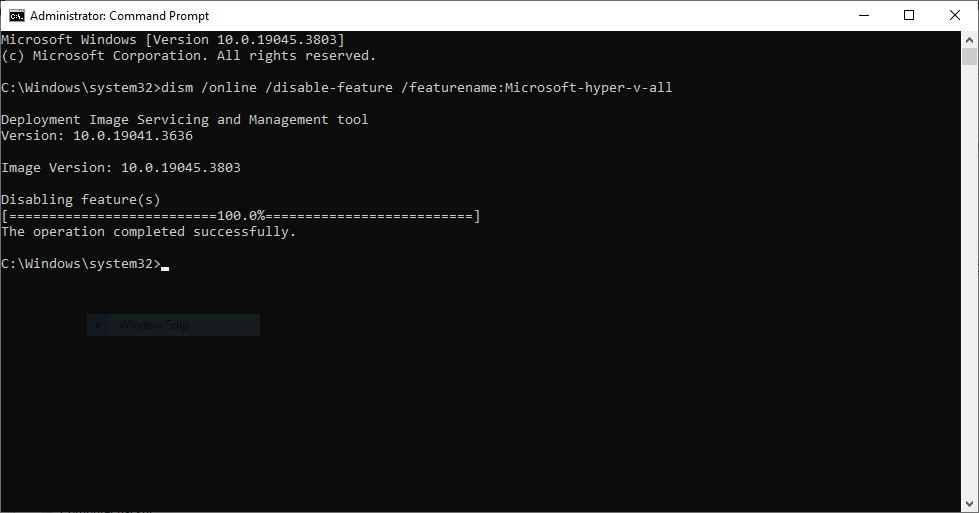 - You should receive a completion message stating that the DISM tool has disabled Hyper-V.