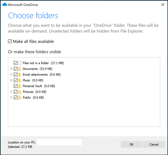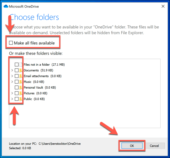 - Disable all of the checkboxes in the Choose folders menu, including Make all files available, then press OK to save.