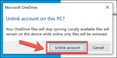 - OneDrive will ask you to confirm that you want to unlink your PC from your OneDrive storage. If you’re happy to proceed, press the Unlink account button.