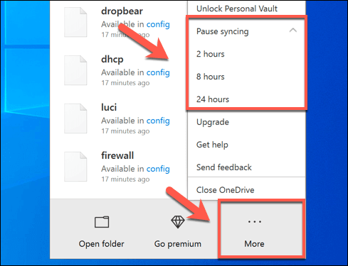 - In the pop-up OneDrive menu, press the More button, then click the Pause Syncing option. You can choose to disable it for 2 hours, 8 hours, or 24 hours—click on one of the options to proceed.
