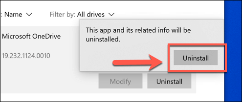 - Windows will ask you to confirm if you want to proceed with the removal. Press the Uninstall button to remove OneDrive from your PC.