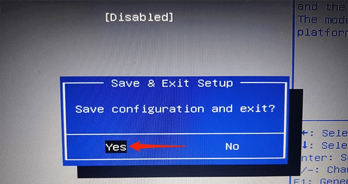 - A **Save & Exit Setup** prompt appears. Select **Yes** in this prompt to continue.