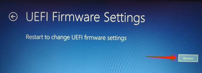 - On the screens that follow, navigate to **Troubleshoot** > **Advanced options** > **UEFI Firmware Settings** > **Restart**.