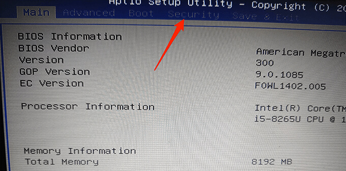 - Your PC should boot into BIOS. * On the BIOS screen, select the **Security** tab at the top. This tab might have a different name depending on your PC’s manufacturer. It might say **Boot**, **Authentication**, or something similar, but you get the idea.