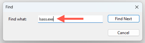 - Type lsass.exe into the Find what field and select Find next.