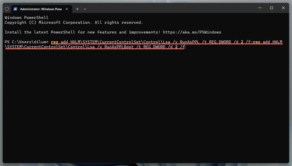 reg add HKLM\SYSTEM\CurrentControlSet\Control\Lsa /v RunAsPPL /t REG_DWORD /d 2 /f;reg add HKLM\SYSTEM\CurrentControlSet\Control\Lsa /v RunAsPPLBoot /t REG_DWORD /d 2 /f