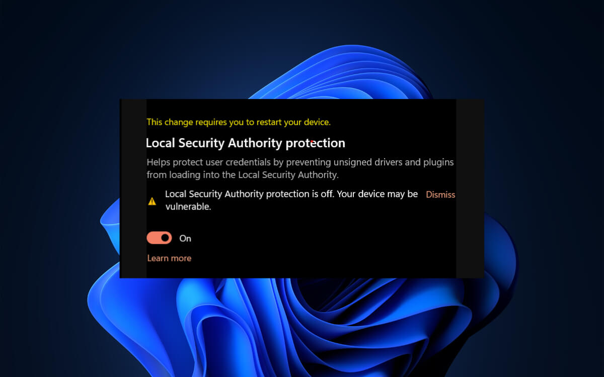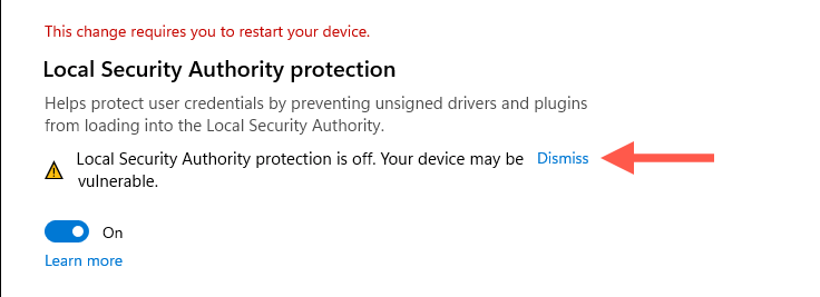 - Select Dismiss next to the “Local Security Authority protection is off” notification.