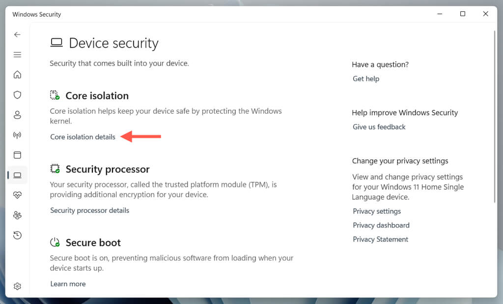 - Under Core isolation, select Core isolation details.