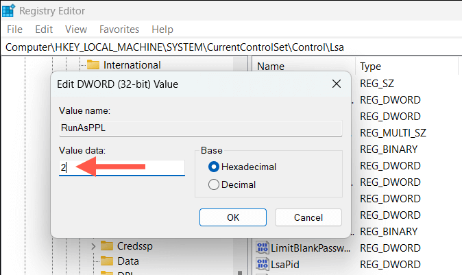 - Ensure Lsa is selected on the left navigation pane, and double-click the RunAsPPL and RunAsPPLBoot entries on the right.