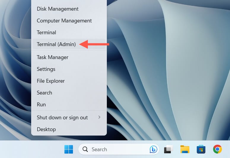 - Right-click the Start button and select Windows Terminal (Admin).