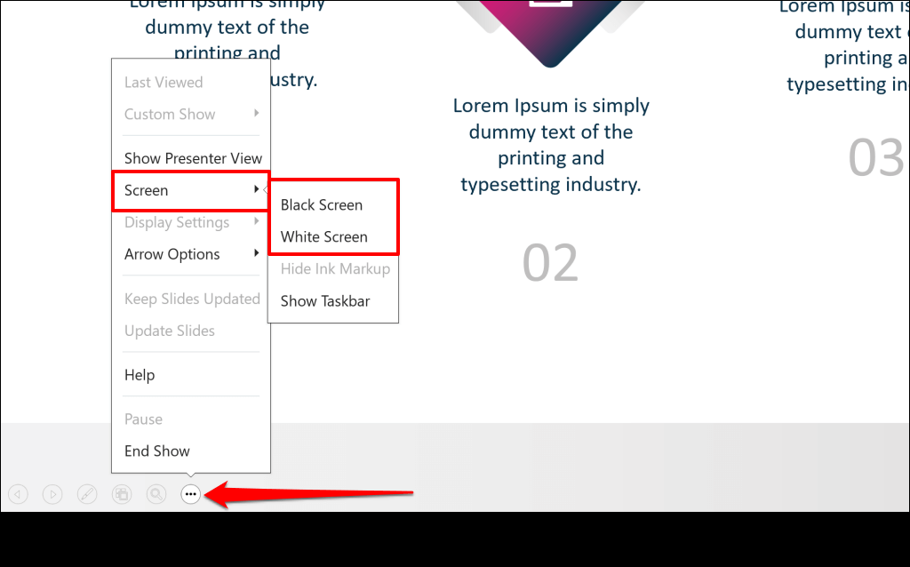 Alternatively, right-click anywhere on the current slide, select Screen, and choose Black Screen or White Screen.