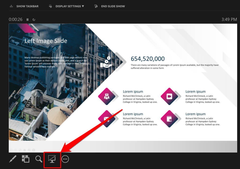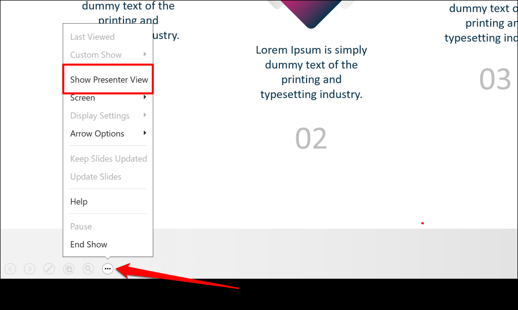 - Switch to Presenter View if you’re in regular presentation mode. Select the three-dot menu icon in the bottom-left corner and choose Show Presenter View.