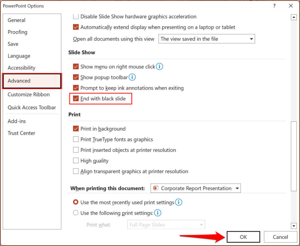 - Open the Advanced tab, scroll to the Slide Show section, and check the End with black slide box.