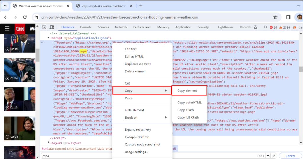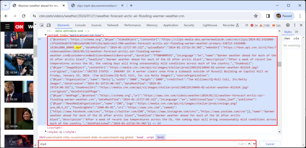 - Extract the video URL from the element you copied in the DevTools environment. The URL link should end with “.mp4.” The link (for a CNN weather video) we extracted looks something like this: **https://clips-media-aka.warnermediacdn.com/cnn/clips/—-338723-1426880-1920x1080_8000k.mp4**.