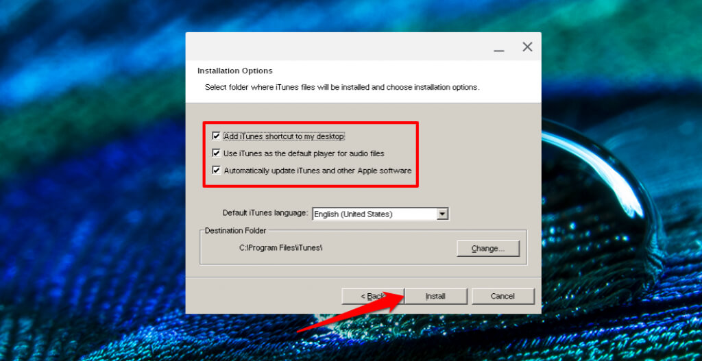 - You’ll find options to add an iTunes shortcut to the desktop, make iTunes your default audio player, and auto-update iTunes. Select Install to continue.
