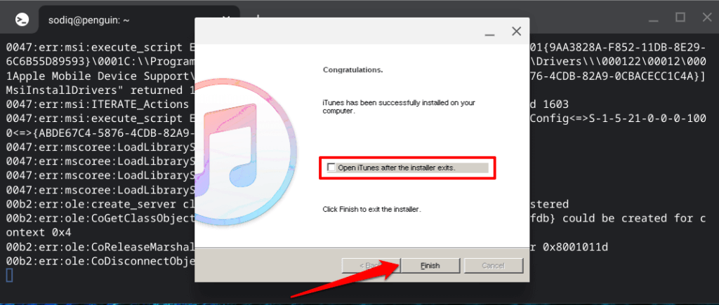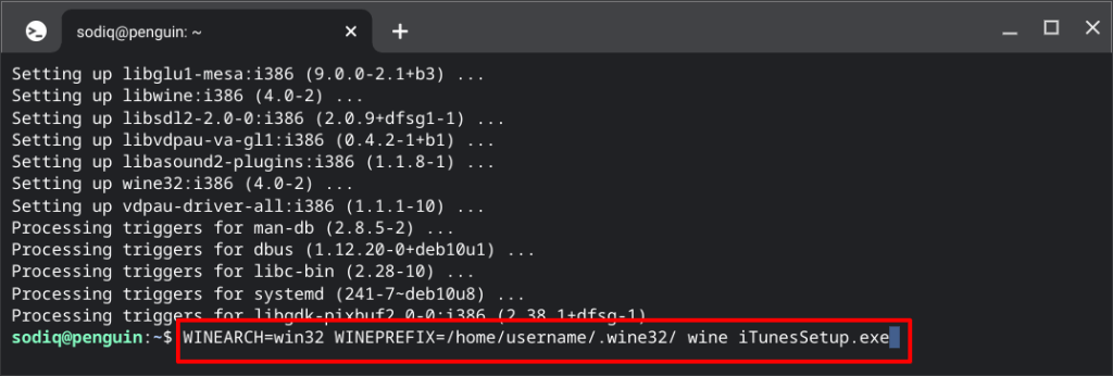 Replace “username” in the command with your Linux username. Likewise, replace “iTunesSetup.exe” if the iTunes executable file has a different name on your Chromebook.