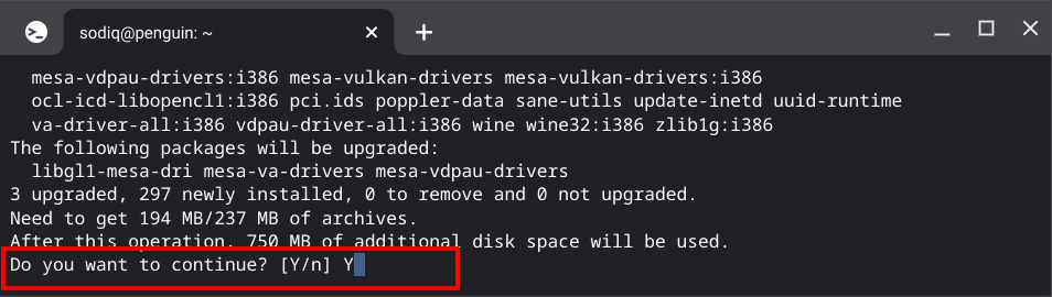 - You may get a prompt to allow the installation to use additional disk space. Press Y on your keyboard and press Enter to proceed.