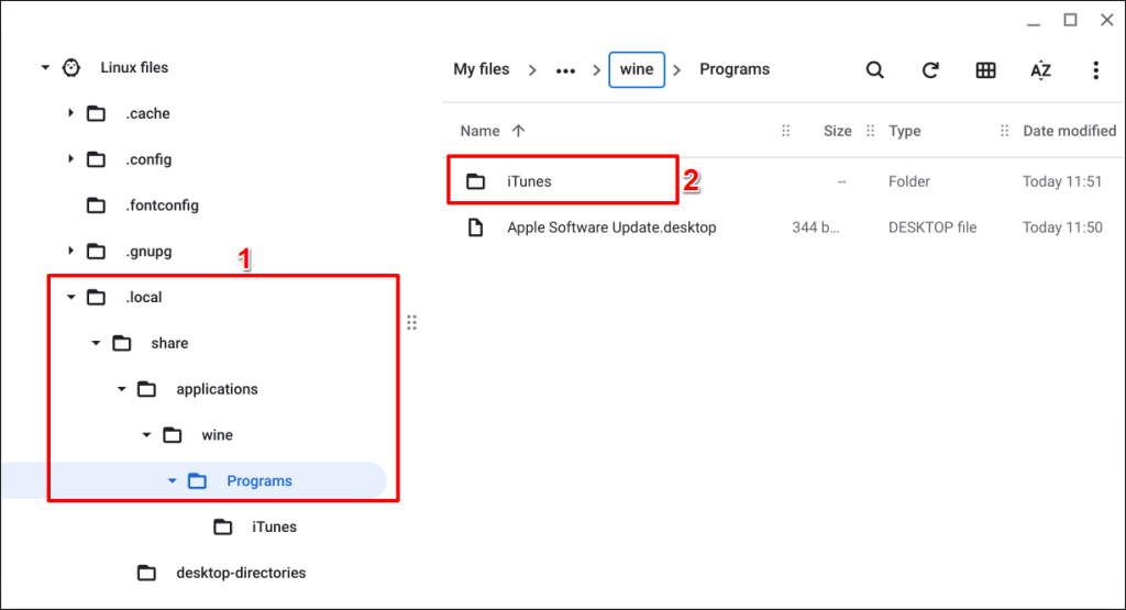 - Navigate to .local > share > applications > wine > Programs and open the iTunes folder.