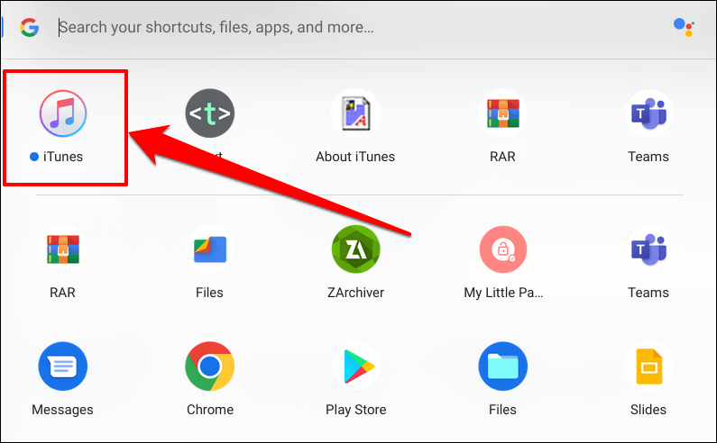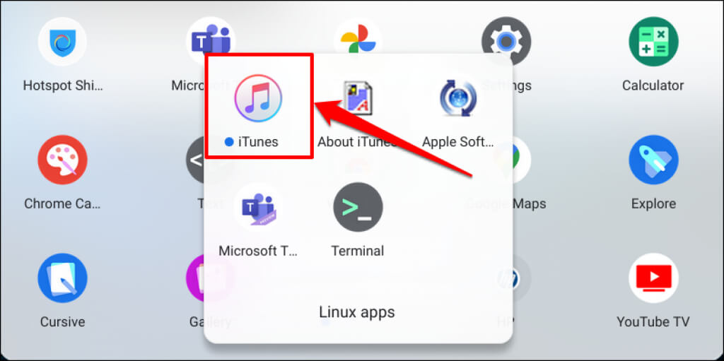 Check the “Linux apps” folder if you don’t find the iTunes app in the central app drawer.