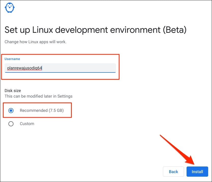 Enter a preferred name in the “Username” dialog box or use the system-generated username. In addition, use the Recommended disk size and select Install to proceed.