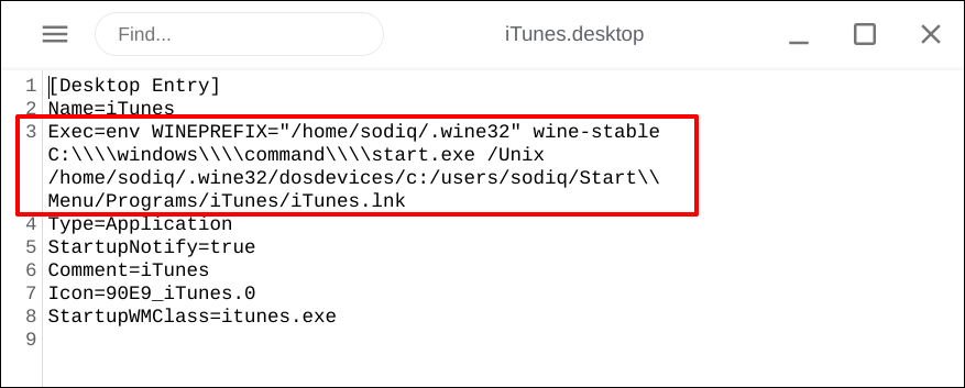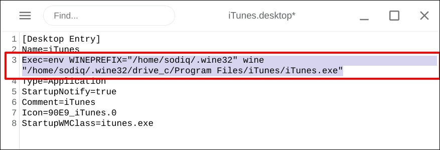 Exec=env WINEPREFIX=”/home/username/.wine32″ wine “/home/username/.wine32/drive_c/Program Files/iTunes/iTunes.exe”