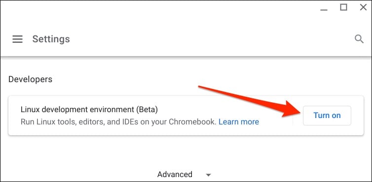 - Head to Settings > Developers > Linux development environment (Beta) and select Turn on.