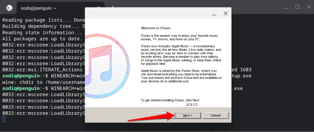 - Everything is set in the Linux environment to install iTunes on your Chromebook. Run the command below to install the iTunes setup file you downloaded earlier.