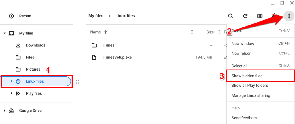 - Open the Linux files folder, select the three-dot menu icon in the top-right corner, and select Show hidden files.