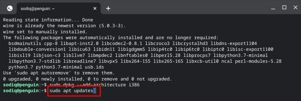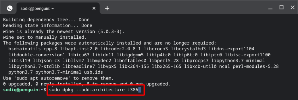 This command installs Wine Linux in the Linux environment. Since you’re installing the 32-bit version of iTunes, run the next command to set up Wine’s 32-bit architecture. That allows Wine to install 32-bit apps without issues.