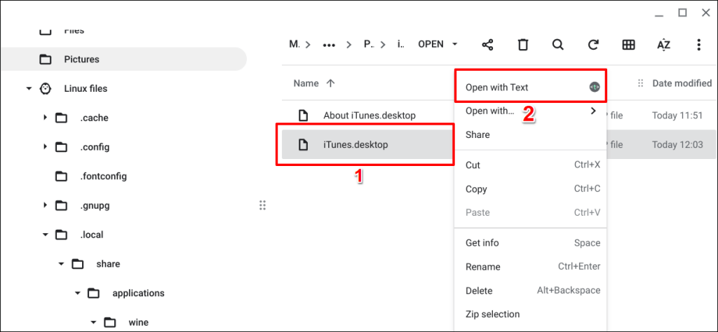 - Right-click the iTunes.desktop file and select Open with Text.