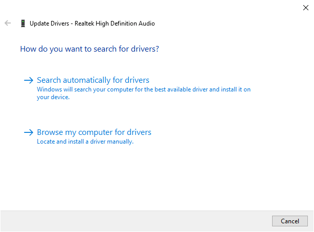 - Select Search automatically for drivers, then wait for the wizard to find and install the latest Realtek audio driver updates. If you downloaded the driver manually, select Browse computer for driver software and select the downloaded file.