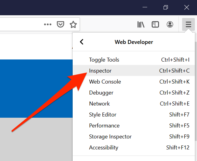 - Click on the three horizontal-lines at the top-right corner, select Web Developer, and click on Inspector. It’ll open the browser’s inspection tool.