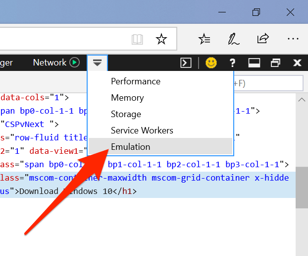 - Click on the down-arrow icon at the top and select Emulation to open the Emulation tab.