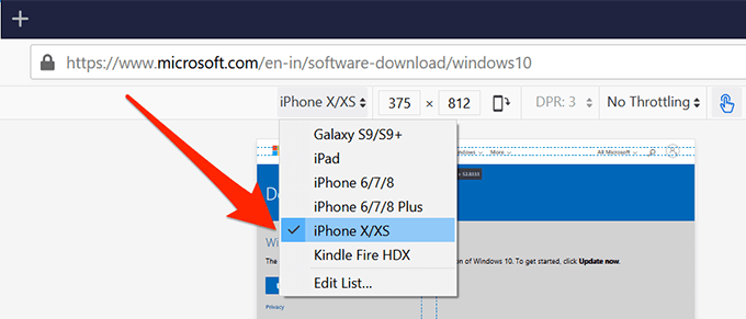 - You’ll see a new dropdown menu beneath the address bar. Click on it and select a non-Windows device, the iPhone X/XS, for example.