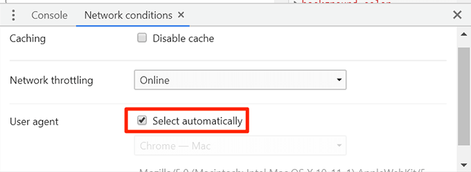 - Select the Network conditions tab and you’ll find an option Select automatically tick-marked next to User agent. Untick the box to disable the option.