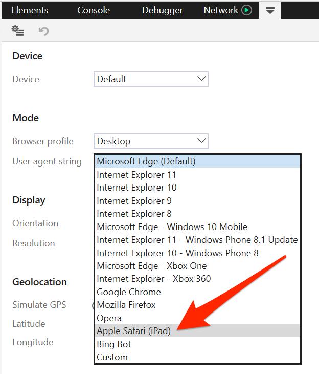 - Click on the dropdown menu for User agent string and select Apple Safari (iPad).