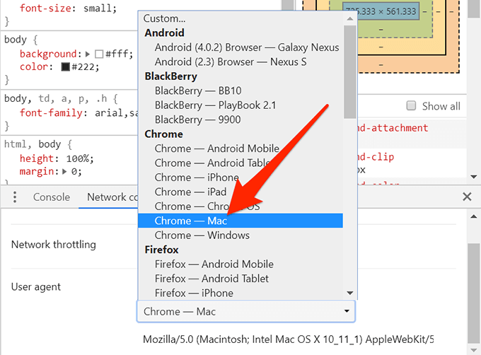 - Click on the dropdown menu and select Chrome – Mac from the available user agents. You want to choose something that isn’t Windows.