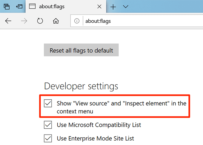 - You’ll see various flags you can enable in the browser. Tickmark the first one that says Show “View source” and “Inspect element” in the context menu.