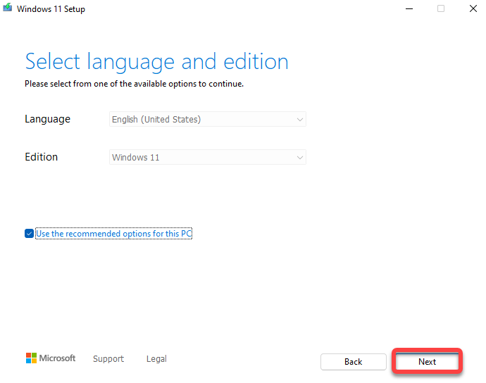 - On the next screen, you’ll need to select the** Language **and **Edition** you want to use. Keep the **Use the recommended options for this PC **checkbox selected and then click **Next**.