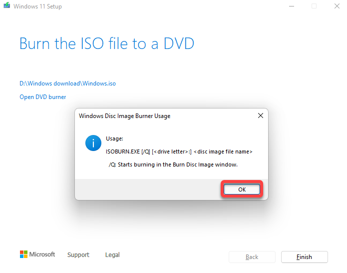 Once the media creation tool completes downloading the ISO, it will show you where the ISO is stored and give you the option to Open DVD Burner. When you click on the** Open DVD Burner** option, it will only show you a command that you’ll need to run in the Command Prompt to burn the ISO.